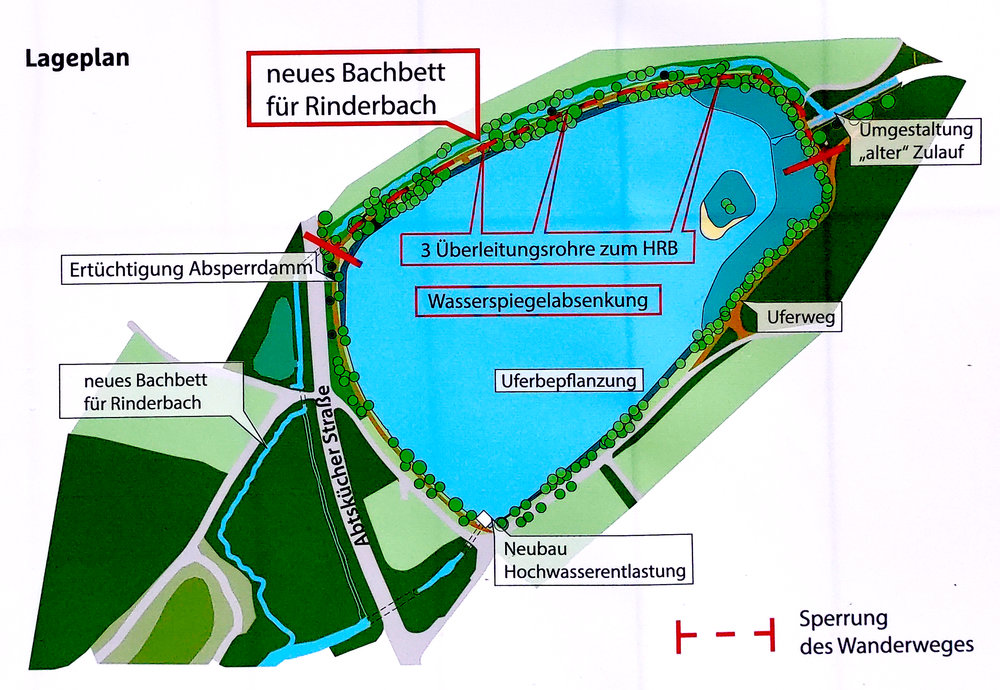 Jetzt haben die Arbeiten für das neue Bachbett des Rinderbach begonnen und in dem Zusammenhang musste der Wanderweg am Nordufer des Stauteich gesperrt werden. Dort werden in den kommen Tagen Baumfällarbeiten durchgeführt, bevor mit den eigentlichen Arbeiten am Bachlauf begonnen werden kann. Für diesen Zeitraum bleibt der Wanderweg in dem Bereich für geplante 3 Monate gesperrt. Die Gesamtmaßnahme soll bis 2027 abgeschlossen sein.